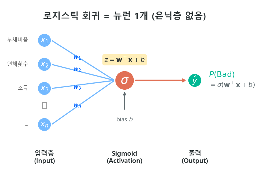 스코어카드 탭에서 다룬 로지스틱 회귀와, 이 ML 탭에서 다루는 신경망은 별개의 모형이 아니다. 로지스틱 회귀는 은닉층이 0개인 신경망이고, 은닉층을 추가하면 MLP가 된다. 전통 스코어카드의 WoE 변환은 사람이 직접 수행하는 "수동 은닉층"으로 볼 수 있다.