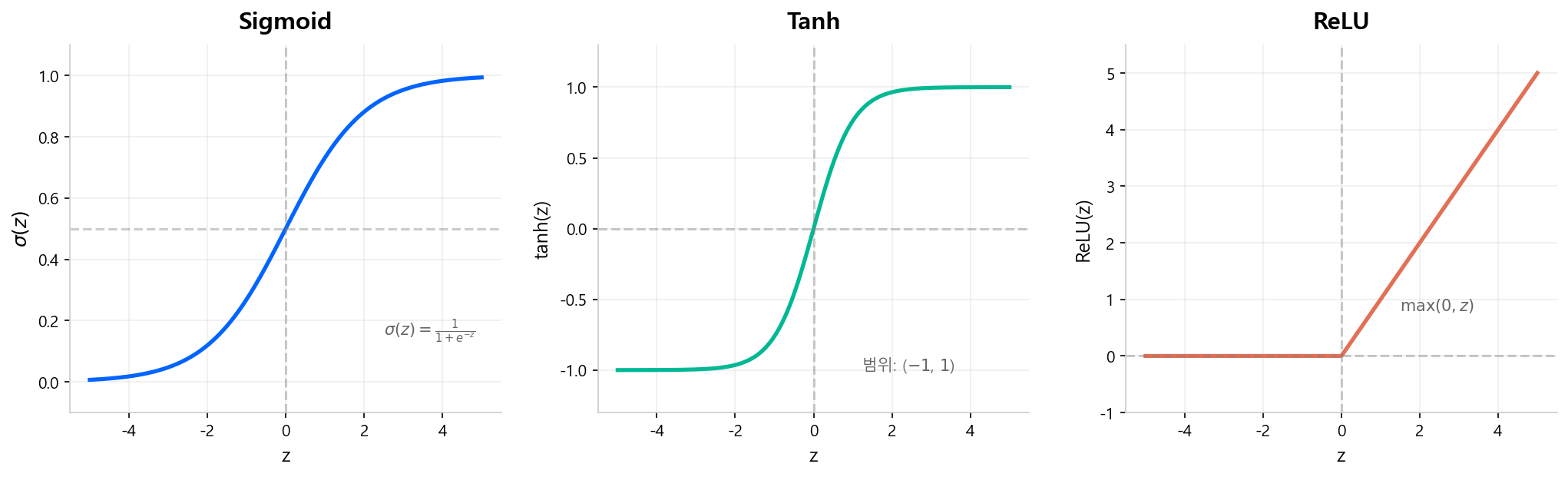 | ReLU | \(\text{ReLU}(z) = \max(0, z)\) | [0, ∞) | 계산 빠름, 현대 딥러닝의 기본 활성함수 |