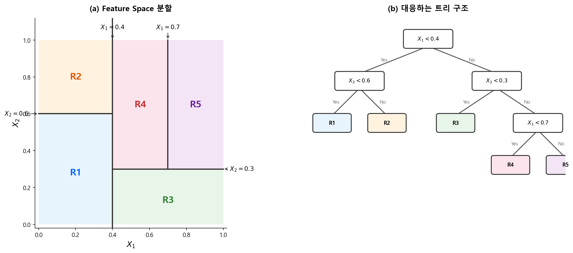 CART는 재귀적 이진 분할(Recursive Binary Splitting)로 Feature Space를 직사각형 영역들로 나눈다. 아래 그림은 2차원 공간에서의 분할과 대응하는 트리 구조를 보여준다.