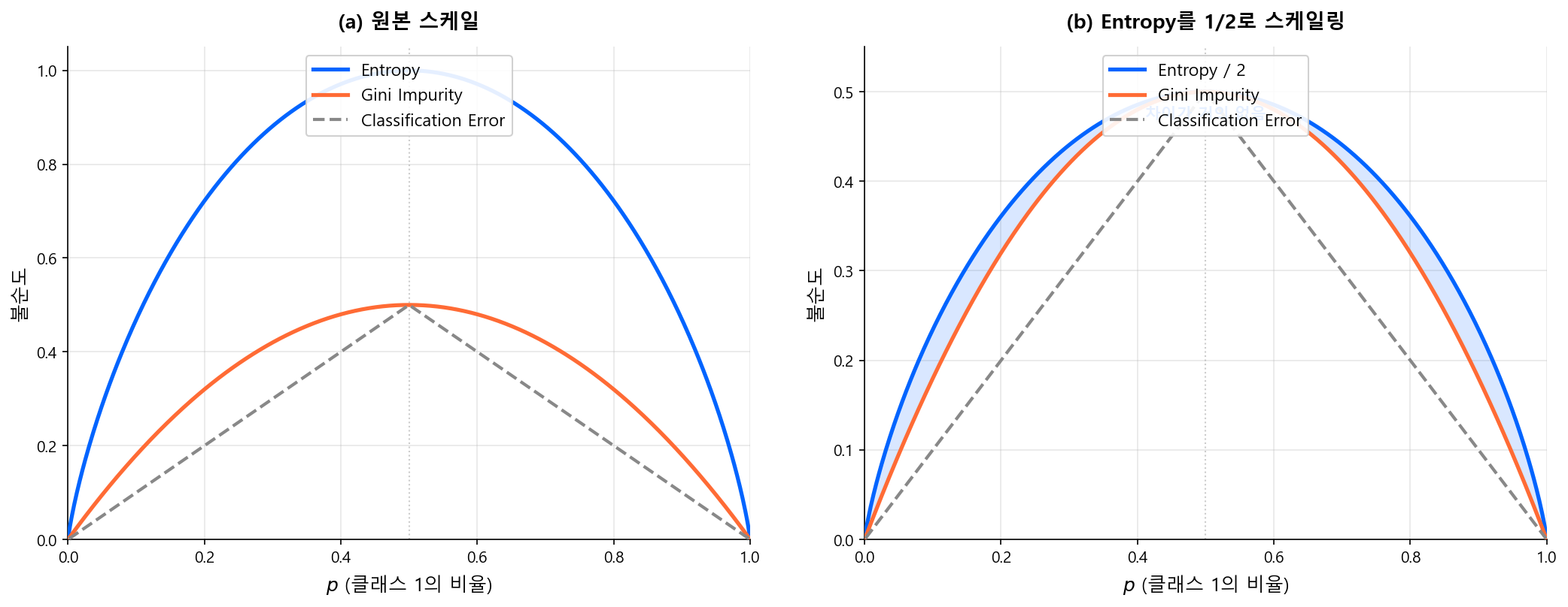 - 범위: 0 (완전 순수) ~ 1 (이진 분류에서 최대 불순)