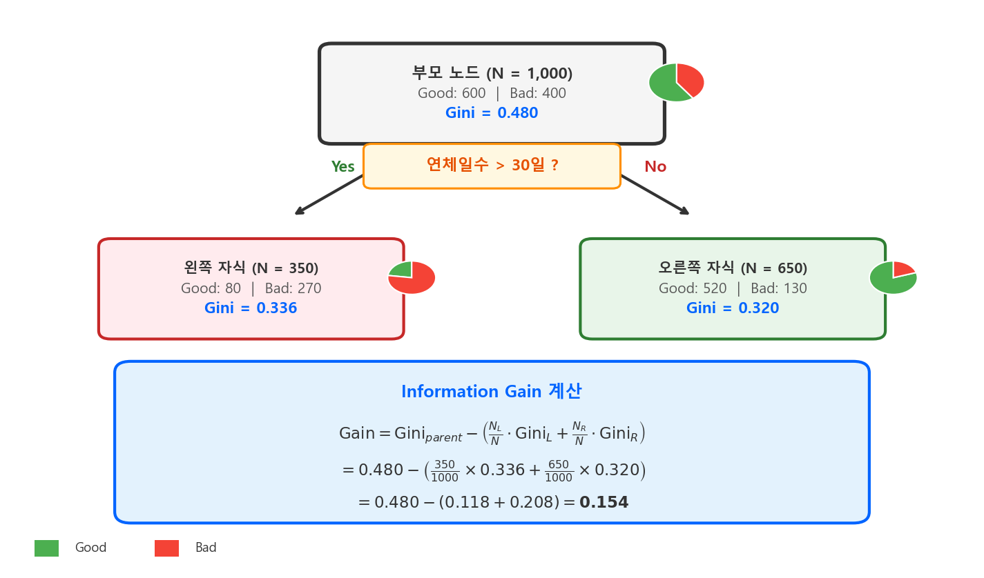 "연체일수 > 30일"로 나누면 왼쪽(30일 이하)은 Bad 5%, 오른쪽(30일 초과)은 Bad 40%로 분리된다. "소득 > 5000만원"으로 나누면 양쪽 모두 Bad 15% 내외로 비슷하다. 전자의 Information Gain이 훨씬 크므로, 트리는 연체일수를 먼저 선택한다.