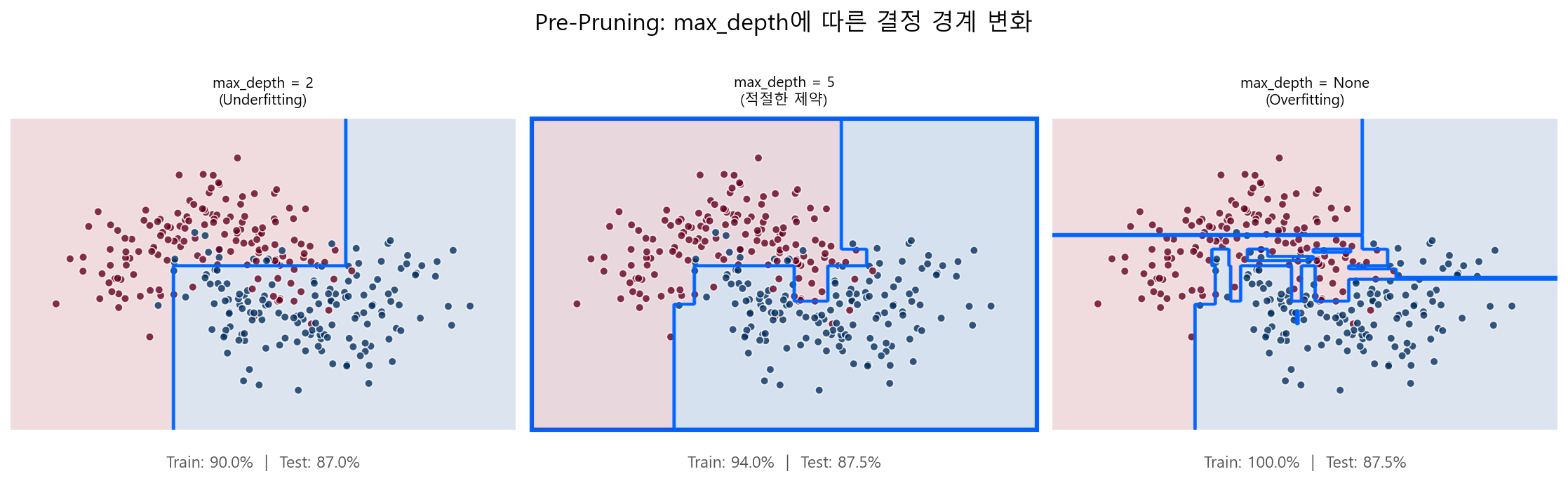 트리를 제약 없이 키우면, 모든 Leaf가 순수해질 때까지 — 극단적으로는 Leaf 하나에 샘플 1개가 될 때까지 — 분할을 계속한다. 이것이 전형적인 과적합(High Variance) 상태다. Bias-Variance Tradeoff에서 다룬 바로 그 "과적합 모형"이다.