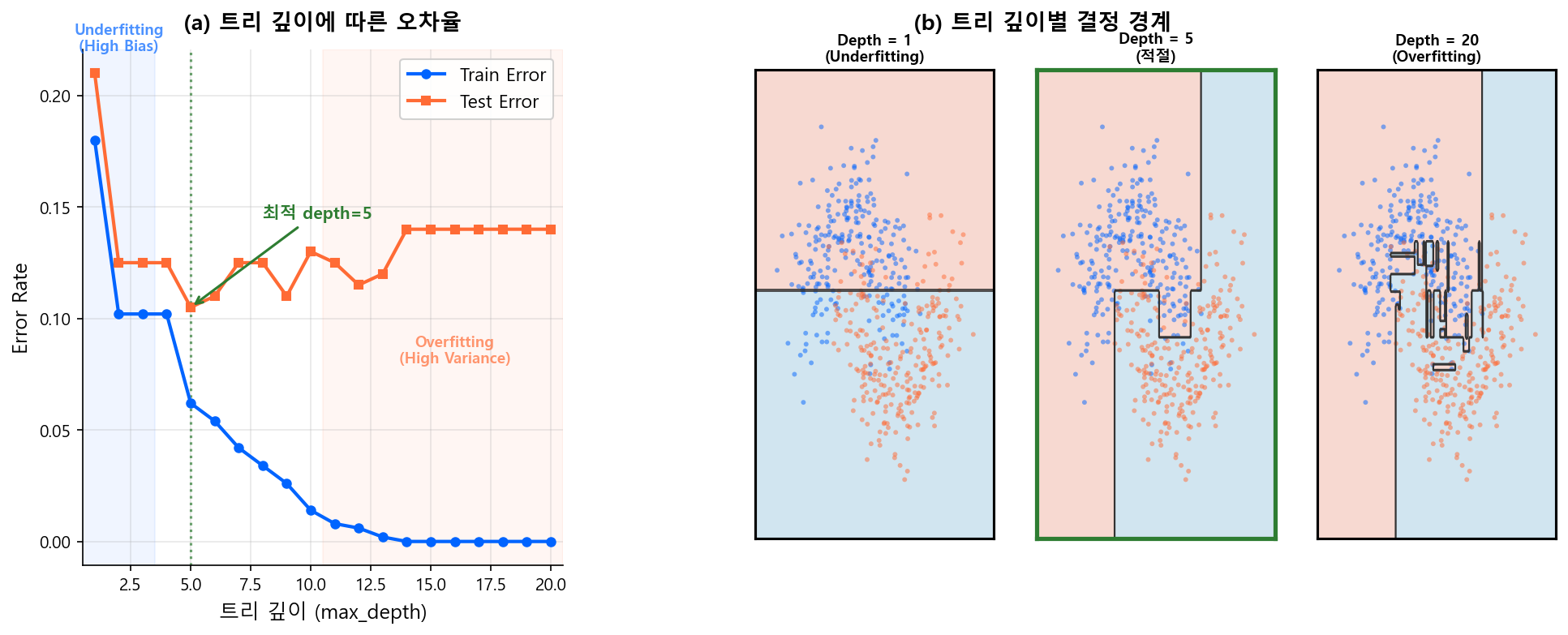 아래 그림은 트리 깊이에 따른 과적합 양상을 보여준다. Train Error는 깊이가 깊어질수록 계속 감소하지만, Test Error는 일정 깊이 이후 오히려 증가한다.