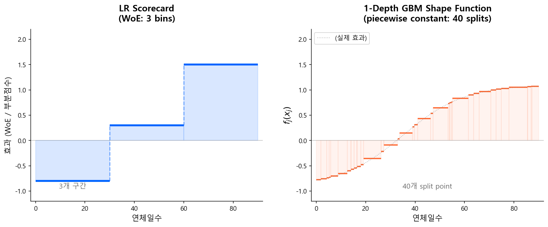 전통 스코어카드에서는 각 변수의 효과가 WoE 구간별 상수 — 굵은 계단 함수였다: