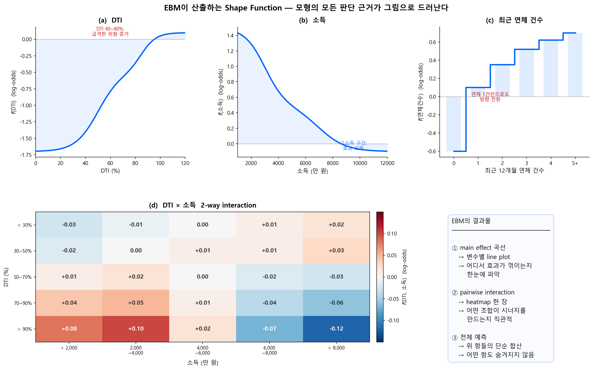 main effect 곡선 (a~c)을 보면, 각 변수가 모형의 예측에 미치는 영향을 한눈에 읽을 수 있다. DTI는 40~80%에서 급등하고, 소득은 고소득 구간에서 포화되며, 연체는 1건만으로도 방향이 전환된다. 이것이 변수마다 독립적인 shape function \(f_j(x_j)\)다.