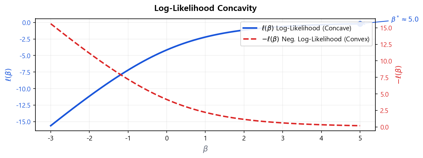 \(\ell(\boldsymbol{\beta})\)는 \(\boldsymbol{\beta}\)에 대해 오목(concave) 함수이므로, 음수를 취한 \(-\ell(\boldsymbol{\beta})\)는 볼록(convex) 함수다.