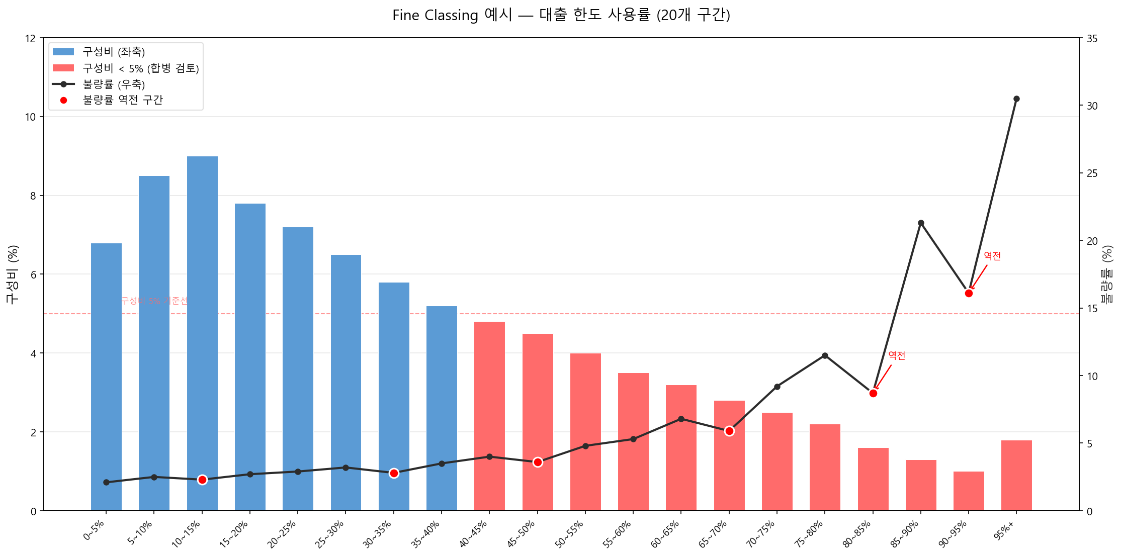 Fine Classing의 구간 수는 통상 20~50개 수준으로 설정한다. 너무 적으면 패턴 탐색이 불충분하고, 너무 많으면 각 Bin의 샘플이 부족해 Bad Rate가 불안정해진다.
