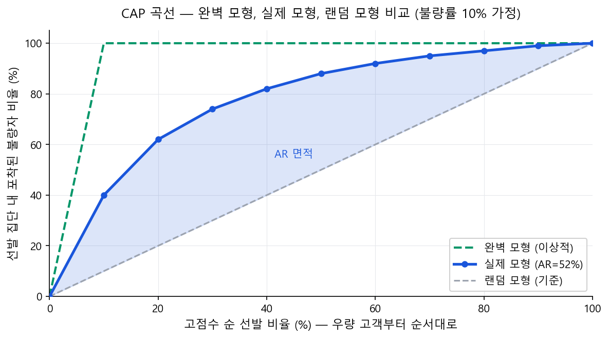 완벽 모형은 상위 10%만 선발해도 불량자 100% 포착(불량률=10%이므로). AR = 실제 모형이 랜덤 모형 위로 만드는 면적 / 완벽 모형이 랜덤 모형 위로 만드는 면적.