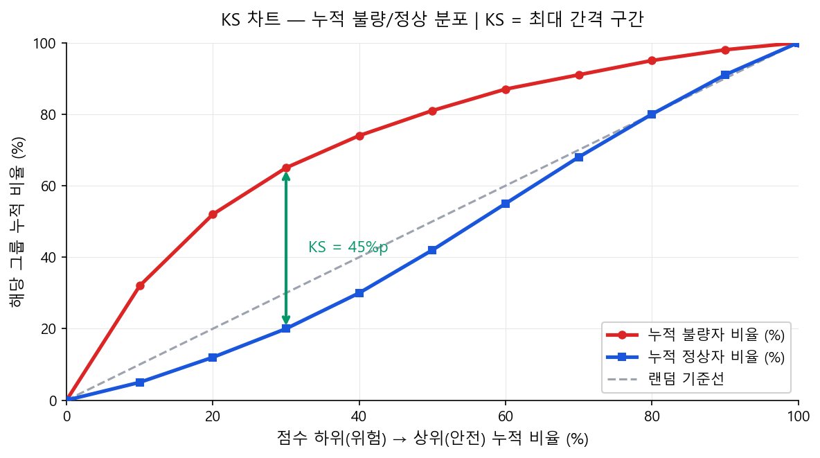 KS는 "점수 기준으로 위험한 고객(저점수)부터 안전한 고객(고점수)까지 나열했을 때, 누적 불량자 비율과 누적 정상자 비율의 최대 차이"다. 쉽게 말하면, 모형이 불량자를 저점수 구간에 얼마나 잘 집중시키는지의 최대 분리 정도다.